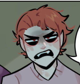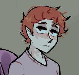 Mikey has pale skin with scattered patches due to his vitiligo, short hair of a light reddish tone, eyes of a deep dark red color, contrasting with the prominent dark circles underneath them.When at home, he usually dresses in comfortable clothes. However, when leaving the house, he bundles up in thick garments to protect himself as much as possible from the sun, adding a hat that helps cover his ears and avoid being discovered by humans.